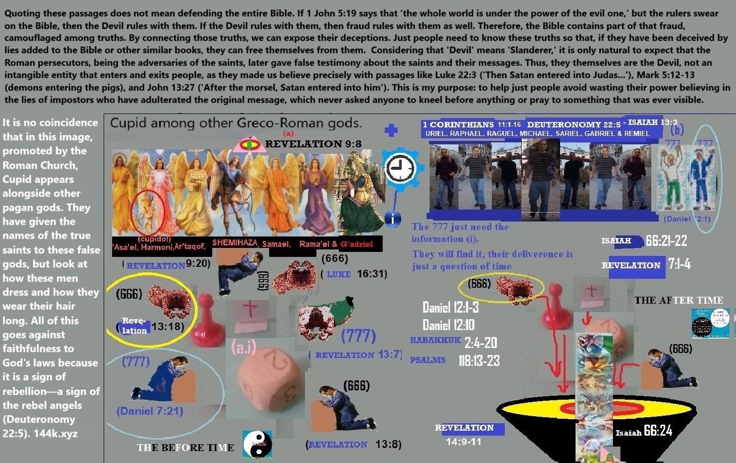 I made the mistake of defending the faith in the Bible, but out of ignorance. However, now I see that it is not the guiding book of the religion that Rome persecuted, but of the one it created to please itself with celibacy. That’s why they preached a Christ who doesn’t marry a woman, but rather His church, and angels who, despite having male names, do not look like men (draw your own conclusions). These figures are akin to the false saints—plaster-statue kissers—and similar to the Greco-Roman gods because, in fact, they are the same pagan gods under different names.