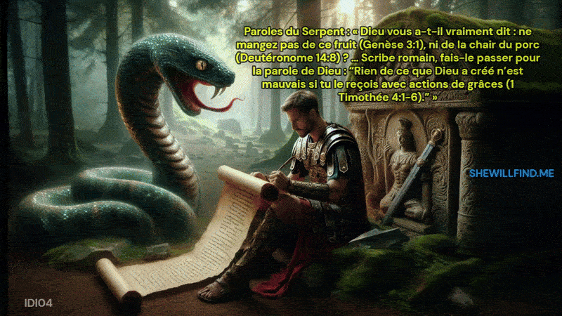 Paroles du Serpent : « Dieu vous a-t-il vraiment dit : ne mangez pas de ce fruit (Genèse 3:1), ni de la chair du porc (Deutéronome 14:8) ? … Scribe romain, fais-le passer pour la parole de Dieu : “Rien de ce que Dieu a créé n’est mauvais si tu le reçois avec actions de grâces (1 Timothée 4:1-6).” »