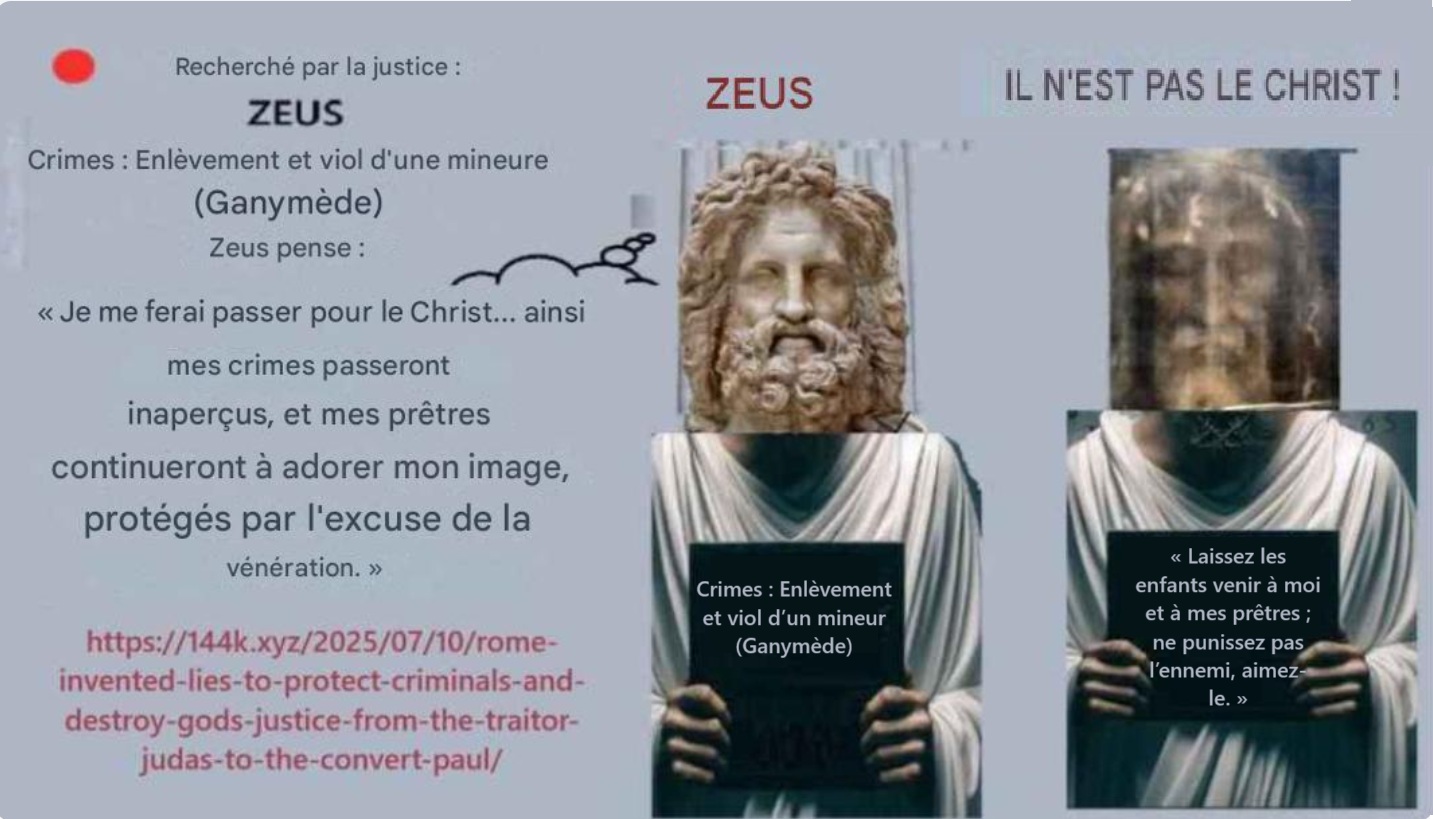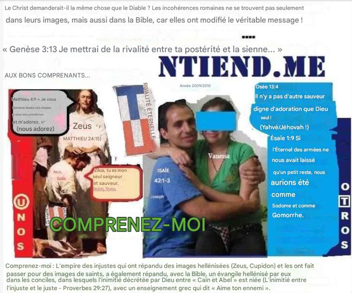 «Maudit soit l’homme qui se confie en l’homme» (Jérémie 17:5)… se confier en la Bible c’est se confier en Rome, qui a déguisé le mensonge avec un peu de vérité. Jésus n’est jamais ressuscité ; en cela la Bible se contredit elle-même. Si nous acceptons que Jésus parla de sa mort et de son retour en Matthieu 21:33-44, nous devons voir que cela se réfère au Psaume 118:1-23. L’ÉTERNEL ne punit que celui qui pèche ; si Jésus se référa à cette prophétie pour son retour, alors à son retour il pèche. S’il pèche ce n’est pas parce qu’il est injuste dans son retour, mais parce qu’il est ignorant. Il n’y a aucun moyen qu’il soit ressuscité le troisième jour, monté au ciel et qu’il revienne du ciel comme le dit Actes 1, car si cela était vrai il n’oublierait pas la vérité ; ne l’oubliant pas il ne pécherait pas ; ne péchant pas Dieu ne le reprendrait pas comme le dit le Psaume 118. De plus, la prophétie d’Osée 6:2 a été sortie de son contexte : elle ne parle pas du troisième jour mais du troisième millénaire («Mille ans sont à tes yeux comme un jour», Psaume 90:4). Et il est dit «le troisième jour il nous fera revivre» au pluriel, non au singulier, car cela se réfère à faire revivre le véritable peuple de Dieu au troisième millénaire. Là Jésus revient à la vie ; réincarné il ne connaît pas la vérité, il pèche parce qu’il est instruit ou trompé par l’une des fausses religions qui dominent le monde ; il est trahi seulement alors. En effet, si tu lis le Psaume 41, il est dit que celui qui fut trahi par celui qui mangeait son pain a péché. Pourtant Jésus, selon d’autres messages de la Bible, n’a jamais péché. Si Jésus n’a jamais péché, la simple mention en Jean 13:18 que la trahison par un certain Judas arriva pour accomplir la prophétie du Psaume 41 manque de cohérence narrative, car cette prophétie parle d’un homme qui a péché puis a été trahi. C’est-à-dire, Rome a caché la véritable histoire de Jésus et a forcé les Écritures sur des événements qui ne sont jamais arrivés. Le Psaume 118 et le Psaume 41 sont liés ; ce sont des prophéties à accomplir seulement à sa seconde venue, dans laquelle les justes tombent, vaincus par les tromperies de la petite corne (Daniel 7), mais en connaissant la vérité sont purifiés de leurs péchés (Daniel 12:1-10)—ce qui n’arrive pas aux incohérents (les injustes, les contradictoires, les calomniateurs)—car seul le peuple de Dieu est libéré. Ainsi tout s’accorde : les véritables sentiments de Jésus ne sont pas d’amour pour les ennemis parce qu’il est juste (Proverbes 29:27). La parabole des vignerons méchants renvoie au Psaume 118 ; l’amour des justes est seulement pour les justes. Si les justes aiment les injustes c’est seulement par ignorance de qui ils sont réellement (Psaume 109). Rome a toujours détruit les histoires de ses ennemis et présenté de fausses histoires ; avec Jésus ce ne fut pas une exception. C’est pourquoi elle a aussi manipulé les textes anciens ; d’où même dans l’Ancien Testament il y a des contradictions. Quiconque se confie dans l’Empire romain et dans sa version des événements est maudit. On dit que les Espagnols ont pillé l’or de l’Amérique, mais les rois catholiques étaient soumis à l’Église ; donc ce ne fut pas l’Espagne, ce fut l’Église romaine—Rome utilisant ses marionnettes—son Église qui aujourd’hui encore maintient les peuples comme colonies, jurant sur sa Bible, avec des drapeaux blancs et jaunes sur leurs places principales. Les politiciens ne les affrontent pas ; ils soutiennent des mensonges pour faire des discours populistes. Quand tu lis des slogans comme «Dieu, patrie et loi», lis entre les lignes : ce que Rome a fait passer pour la parole de Dieu (elle-même), la patrie comme sa colonie, et la loi façonnée à sa mesure. Voilà pourquoi il n’y a pas de peine de mort, parce que l’Église ne la veut pas : ils ne sont pas contre le peuple du mal, mais de son côté—tout comme Rome persécutrice était du côté des injustes, Rome qui ne s’est jamais convertie à la foi qu’elle persécutait mais l’a falsifiée.
