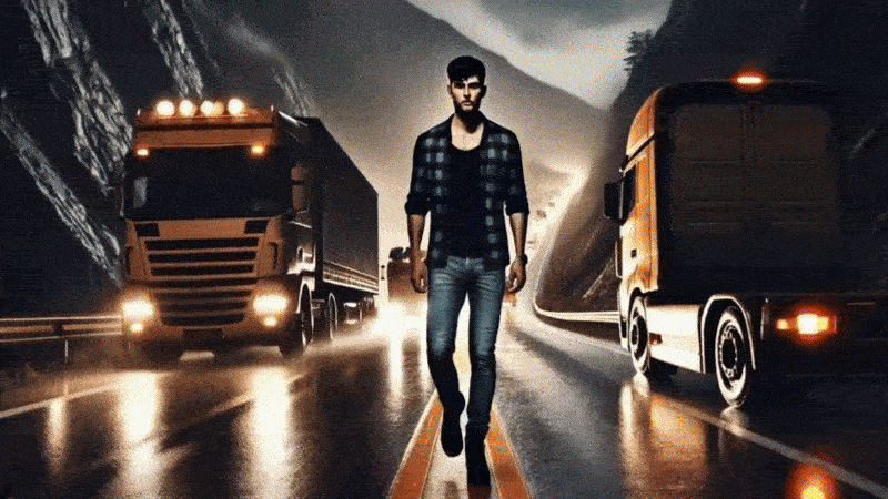 and the lights of trucks coming from behind cast their glow on the mountain in front of him.