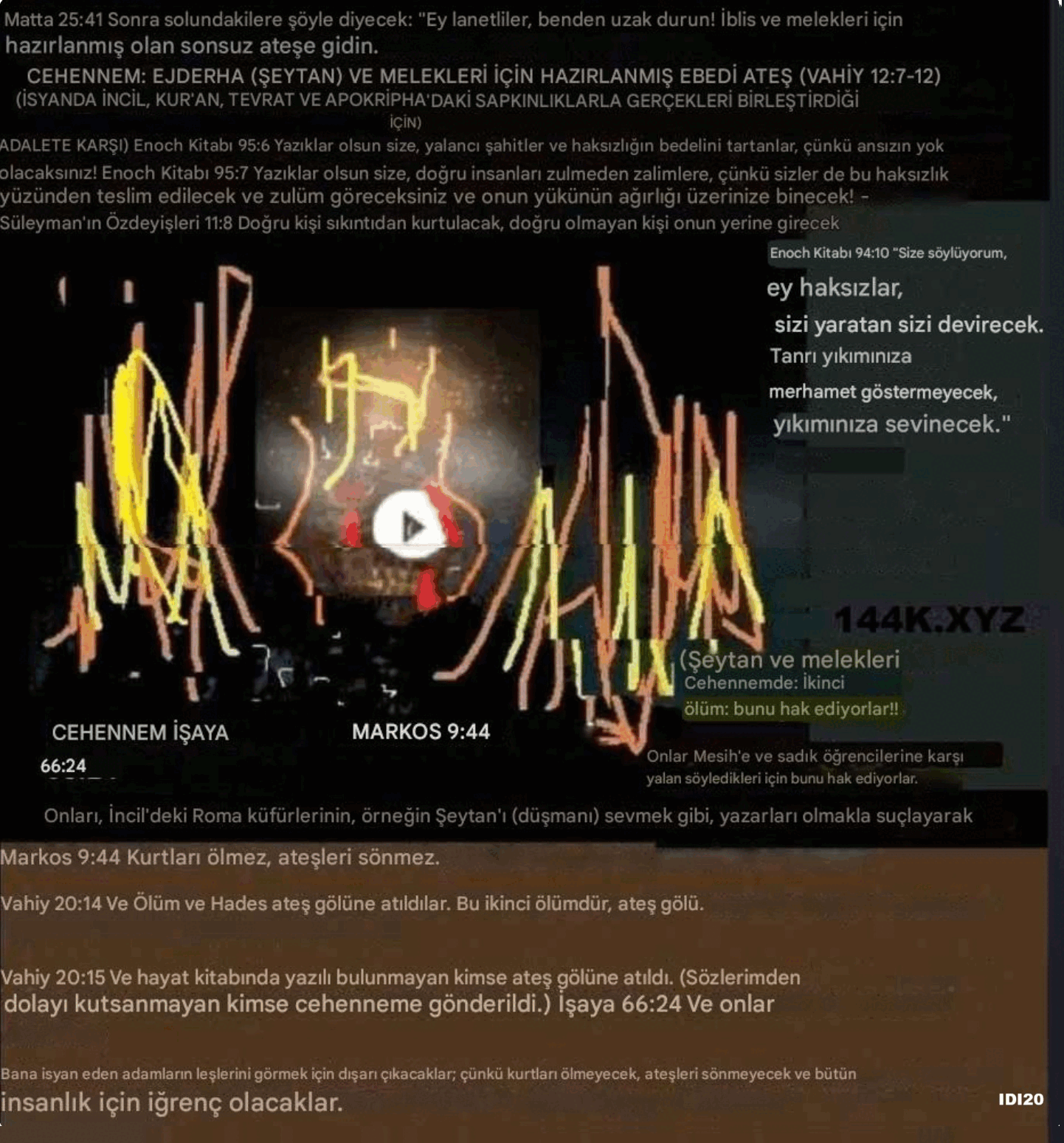 Cehennemdeki yılan, iblis veya Şeytan (iftiracı) (Yeşaya 66:24, Markos 9:44). Matta 25:41: “Sonra solundakilere, ‘Ey lanetliler, benden çekilin, İblis ve melekleri için hazırlanmış olan sonsuz ateşe gidin’ diyecek.” Cehennem: Yılan ve melekleri için hazırlanmış olan sonsuz ateş (Vahiy 12:7-12), İncil, Kuran, Tevrat’taki gerçekleri sapkınlıklarla birleştirdiği ve sahte kutsal kitaplardaki yalanlara itibar kazandırmak için apokrif dedikleri sahte, yasaklanmış müjdeler yarattığı için, hepsi adalete karşı bir isyandır.
