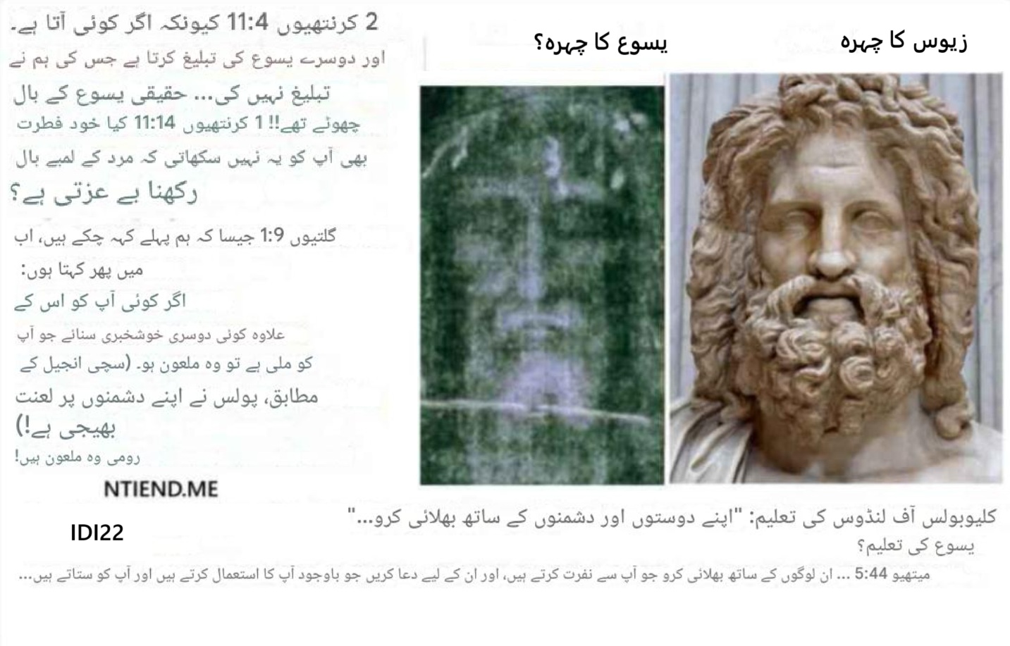یسوع کے ظہور کے بارے میں بائبل کے تضادات: تصویر کا دعویٰ ہے کہ پال اور عیسیٰ دونوں کے بال چھوٹے تھے، بائبل کی آیات کی بنیاد پر۔ تاہم، یسوع کی زیادہ تر روایتی عکاسیوں میں اسے لمبے بالوں کے ساتھ دکھایا گیا ہے، جو ان صحیفوں سے متصادم ہے۔