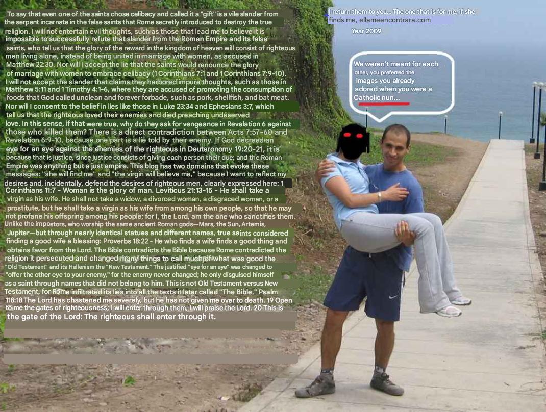 Ang kanilang ipinapangaral ay isang mensaheng hindi umaayon sa interes ng tunay na mga banal. Kaya ito ang aking pagsisisi para sa aking hindi sinasadyang kasalanan. Sa pagtanggi sa isang huwad na relihiyon, tinatanggihan ko rin ang iba pa. At kapag natapos ko na ang aking pagsisisi, patatawarin ako ng Diyos at pagpapalain niya ako sa pamamagitan niya—ang natatanging babaeng aking hinahanap. Sapagkat bagaman hindi ako naniniwala sa buong Bibliya, naniniwala ako sa mga bahagi nitong makatwiran at makatuwiran; ang iba pa ay paninirang-puri mula sa mga Romano.
