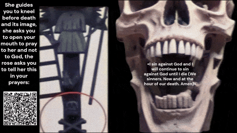 Ang babae ay tumatapak sa ahas; nagtatanggol ang ahas sa pamamagitan ng paggawa ng katotohanan na idolatriya, ngunit nakialam si Gabriel sa pamamagitan ng pagsira sa tanggulan ng ahas upang maapakan ito ng babae. █
