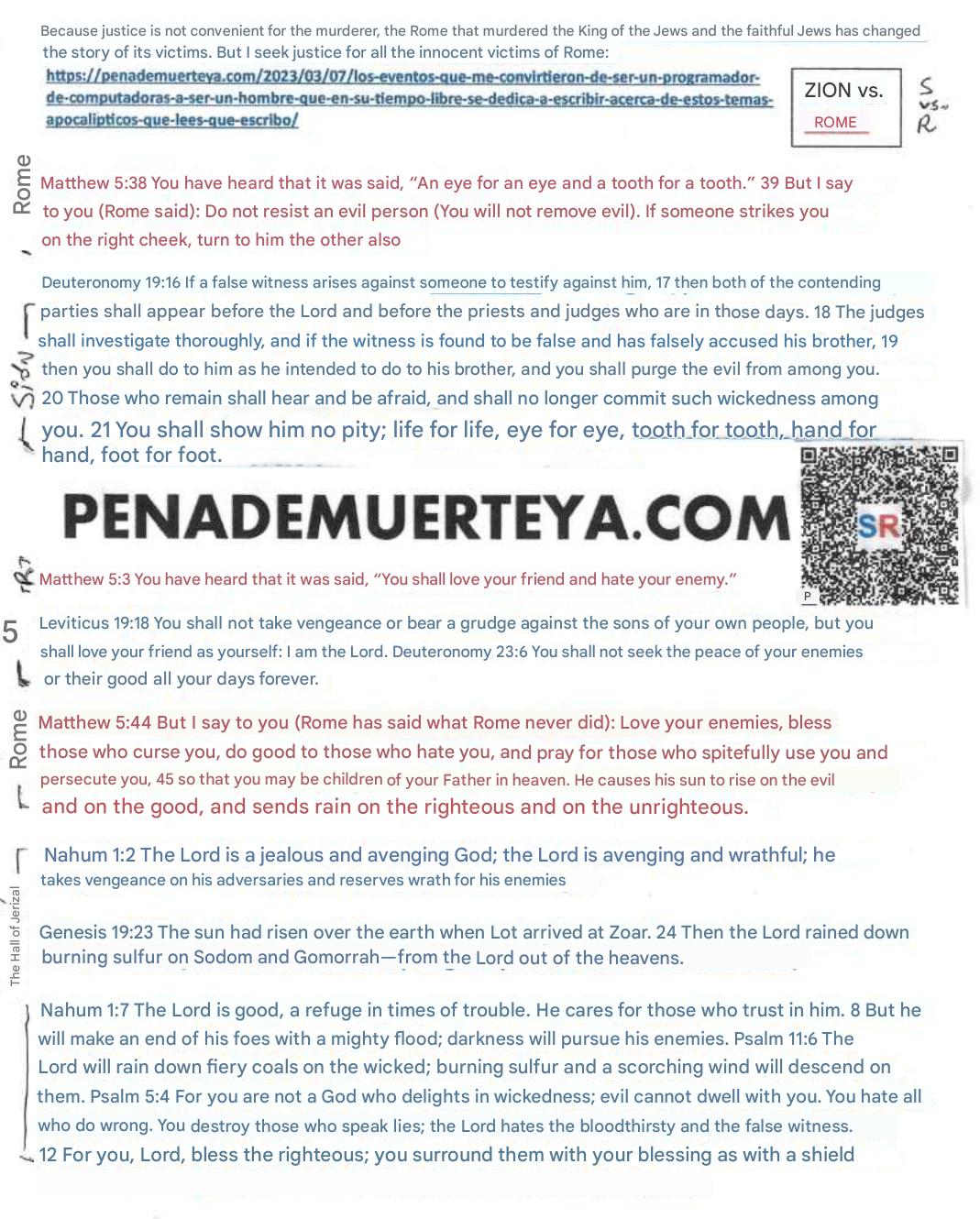 Pinatay ng Roma si Hesus at ang iba pang mga banal sa pamamagitan ng sarili nilang mga legionaryo; ngunit dahil hinatulan sila ng kautusang “mata sa mata”, gumawa sila ng isang kasinungalingan: ipinahayag nila na pinatawad sila ng kanilang biktima, pinawalang-bisa ang makatarungang pagganti, at ipinahayag ang pag-ibig sa kaaway.