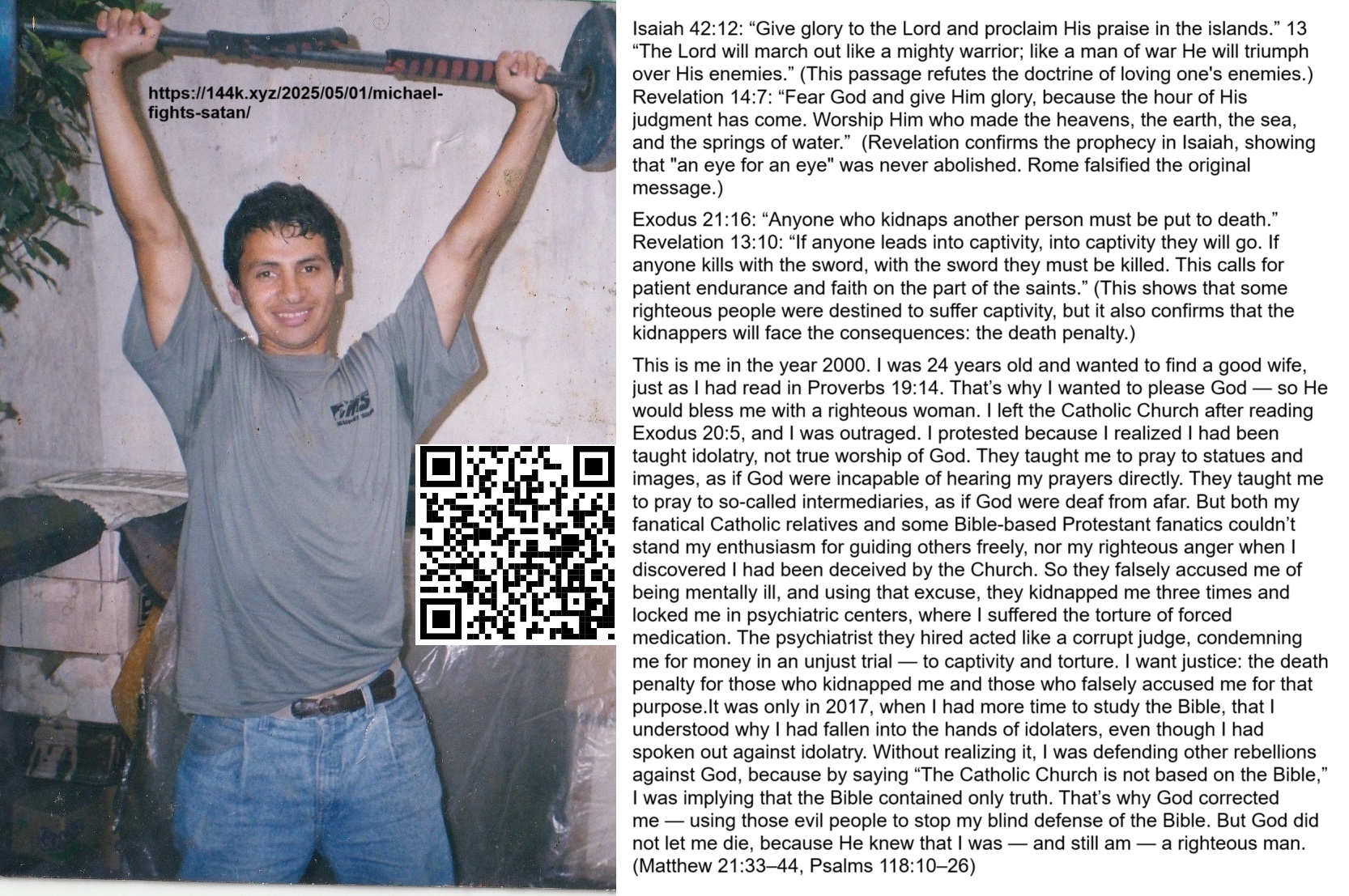 “The religion I defend is named justice. What does it mean in Revelation that the beast and the kings of the earth wage war on the rider of the white horse and his army? The meaning is clear, the world leaders are hand in glove with the false prophets who are disseminators of the false religions that are dominant among the kingdoms of the earth, for obvious reasons, that includes Christianity, Islam, etc. These rulers are against justice and truth, which are the values defended by the rider of the white horse and his army loyal to God. As is evident, the deception is part of the false sacred books that these accomplices defend with the label of “Authorized Books of Authorized Religions”, but the only religion that I defend is justice, I defend the right of the righteous not to be deceived with religious deceptions. Revelation 19:19 Then I saw the beast and the kings of the earth and their armies gathered together to make war against the rider on the horse and against his army. This summary is about me: Jose, a young man educated in Catholic teachings, lived a series of events marked by complex relationships and manipulations. At 19, he began a relationship with Monica, a possessive and jealous woman. Although Jose felt that he should end the relationship, his religious upbringing led him to try to change her with love. However, Monica’s jealousy intensified, especially towards Sandra, a classmate who was making advances on Jose. Sandra began to harass him in 1995 with anonymous phone calls, in which she made noises with the keyboard and hung up. On one of those occasions, she revealed that she was the one calling, after Jose asked angrily in the last call: “Who are you?” Sandra called him immediately, but in that call she said: “Jose, who am I?” Jose, recognizing her voice, told her: “You are Sandra,” to which she replied: “You already know who I am.” Jose avoided confronting her. During that time, Monica, obsessed with Sandra, threatened to hurt her, which led Jose to protect Sandra and prolong his relationship with Monica, despite his desire to end it. Finally, in 1996, Jose broke up with Monica and decided to get closer to Sandra, who had initially shown interest in him. When Jose tried to talk to her about his feelings, Sandra did not allow him to explain himself, she treated him with offensive words and he did not understand the reason. Jose chose to distance himself, but in 1997 he believed he had the opportunity to talk to Sandra, hoping that she would explain her change of attitude and be able to share the feelings that she had kept silent. However, Sandra never gave him clear answers, maintaining the intrigue with evasive and counterproductive attitudes. Faced with this attitude, Jose decided not to look for her anymore. It was then that constant telephone harassment began. The calls followed the same pattern as in 1995 and this time were directed to the house of his paternal grandmother, where Jose lived. He was convinced that it was Sandra, since he had recently given her the number. These calls were constant, morning, afternoon, night and early morning, and they lasted for months. When a family member answered, they did not hang up, but when José answered, the clicking of the keys could be heard before hanging up. Jose asked his aunt, the owner of the phone line, to request the log of incoming calls to the service provider. He planned to use that information as evidence to contact Sandra’s family and express his concern about what she was trying to achieve with this behavior. However, his aunt downplayed his argument and refused to help him. Strangely, no one in the house, neither his aunt nor his paternal grandmother, seemed to be outraged by the fact that the calls also occurred in the early morning, and they did not bother to look into how to stop them or identify the person responsible. Although Jose initially ignored the calls, he eventually relented and contacted Sandra again, influenced by biblical teachings that advised praying for those who were persecuting him. However, Sandra emotionally manipulated him, alternating between insults and requests for him to continue looking for her. After months of this cycle, José discovered that it was all a trap. Sandra falsely accused him of sexual harassment and orchestrated a beating of criminals against him. These events left a deep mark on José, who seeks justice and to expose those who manipulated him. In addition, he seeks to derail the advice in the Bible, such as “pray for those who insult you,” because by following that advice, he fell into Sandra’s trap.” Number of days of purification: Day # 377 https://144k.xyz/2024/12/16/this-is-the-10th-day-pork-ingredient-of-wonton-filling-goodbye-chifa-no-more-pork-broth-in-mid-2017-after-researching-i-decided-not-to-eat-pork-anymore-but-just-the/