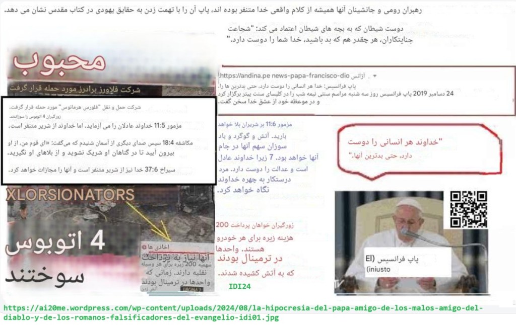 من این نظر را زیر ویدئویی گذاشتم که اخبار معمولی این روزها در پرو و سایر کشورهای آمریکای جنوبی را بازگو میکرد: موجی از اخاذی علیه شرکتهای حمل و نقل عمومی، که قبلاً منجر به دهها مرگ شده است، در حالی که هیچ اخاذی توسط سیستم به اعدام محکوم نشده است، اولاً به دلیل غیرقانونی بودن اعدام در پرو، که من آن را هدر دادن مالیات میدانم – مسئله این نیست که کارگران زندان بعداً بیکار شوند، بلکه این است که به جای مراقبت از انگلها، خود را وقف چیز دیگری کنند. @saintgabriel4729 3 دقیقه پیش (ویرایش شده) چرخاندن گونهٔ دیگر به مجرم یعنی: به او غذا دادن، وقتی بیمار است از او مراقبت کردن، به او پناه دادن، او را از خودکشی محافظت کردن (زندان). به همین دلیل است که جامعه به این شکل است: آنها به کسانی که از این انفعال دفاع میکنند ‘آمین’ میگویند و به کسانی که از چشم در برابر چشمِ موجه دفاع میکنند، نمیگویند. آنها شما را با تصاویر به تخت انگشتان خود هدایت میکنند: ‘بیرون بیایید، نشان دهید که از ما اطاعت میکنید و ما اربابان شما هستیم…’ آنها نه خدا، بلکه روم را خدمت میکنند، آن روم باجگیر و غارتگر امپراتوری روم. به همین دلیل است که باجگیران سلطنت میکنند، از کسانی که منتقدان خود را با لعنتهای الهی تهدید میکنند تا کسانی که اتوبوسها را آتش میزنند. لعنت واقعی این است که شیاطین در یک اتوبوس به شما حمله میکنند و به مجازاتی که سزاوار آن هستند نمیرسند، توسط سیستمی که تسلیم تصاویر امپراتوری روم شده است.