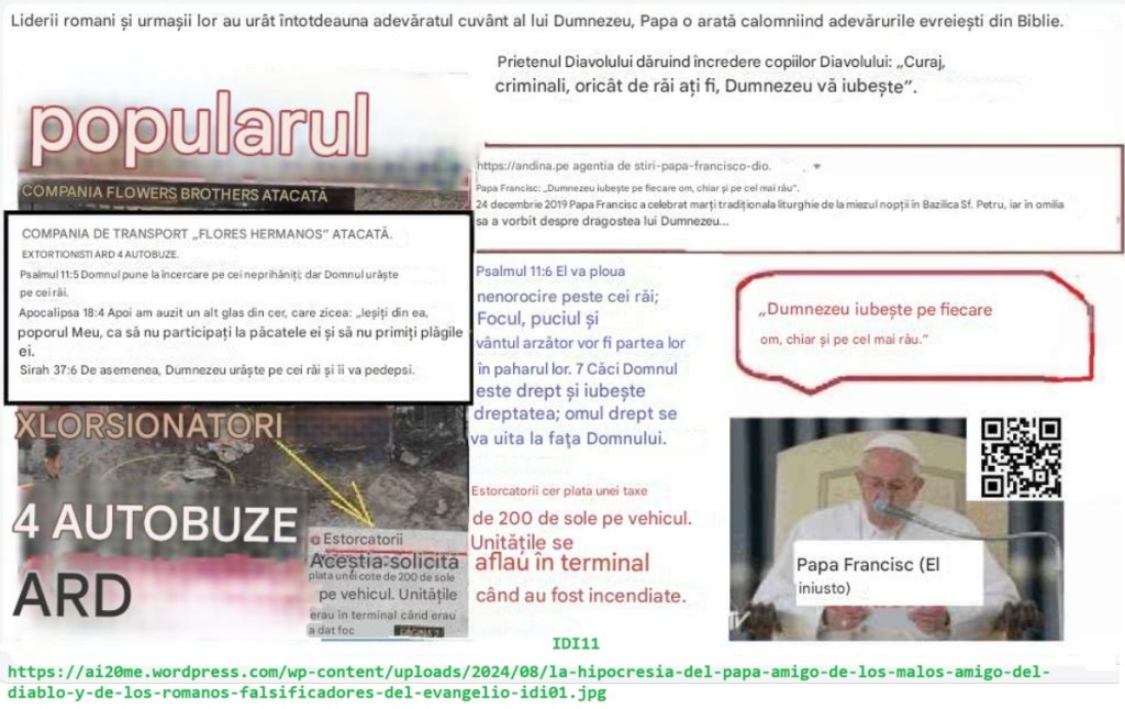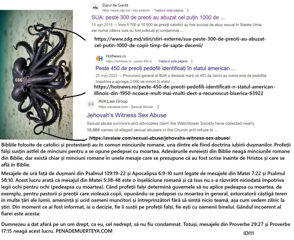 https://144k.xyz/wp-content/uploads/2025/03/idi11-ea-ma-va-gasi-iar-femeia-fecioara-va-crede-in-mine.docx Ea mă va găsi, iar femeia fecioară va crede în mine. ( https://ellameencontrara.com – https://lavirgenmecreera.com – https://shewillfind.me ) Acesta este grâul din Biblie care distruge neghina romană din Biblie: Apocalipsa 19:11 Apoi am văzut cerul deschis și iată un cal alb; iar cel ce ședea pe el se numea ‘Credincios și Adevărat’, și în dreptate judecă și face război. Apocalipsa 19:19 Apoi am văzut fiara și pe împărații pământului, împreună cu oștirile lor, adunați ca să facă război împotriva celui ce ședea pe cal și împotriva oștirii lui. Psalmii 2:2-4 ‘Împărații pământului s-au răsculat, și domnitorii s-au sfătuit împreună împotriva Domnului și împotriva Unsului Său, zicând: ‘Să rupem legăturile lor și să aruncăm de la noi lanțurile lor.’ Cel ce șade în ceruri râde; Domnul își bate joc de ei.’ Acum, un pic de logică de bază: dacă călărețul luptă pentru dreptate, dar fiara și împărații pământului luptă împotriva lui, atunci fiara și împărații pământului sunt împotriva dreptății. Prin urmare, ei reprezintă înșelăciunea religiilor false care domnesc împreună cu ei. Marea desfrânată Babilon, care este biserica falsă creată de Roma, s-a considerat ‘soția Unsului Domnului.’ Dar profeții mincinoși ai acestei organizații de vânzare a idolilor și de lingușire nu împărtășesc obiectivele personale ale Unsului Domnului și ale adevăraților sfinți, deoarece liderii nelegiuiți au ales calea idolatriei, celibatului sau a sanctificării căsătoriilor nelegiuite în schimbul banilor. Sediile lor religioase sunt pline de idoli, inclusiv cărți sfinte false, înaintea cărora se închină: Isaia 2:8-11 8 Țara lor este plină de idoli; se închină la lucrarea mâinilor lor, la ceea ce au făcut degetele lor. 9 Omul este plecat, și omul s-a smerit; de aceea, nu-i ierta. 10 Intră în stâncă, ascunde-te în țărână, dinaintea înfricoșatei prezențe a Domnului și a strălucirii măreției Lui. 11 Mândria privirilor omului va fi smerită, și trufia oamenilor va fi coborâtă; și numai Domnul va fi înălțat în ziua aceea. Proverbele 19:14 Casa și averea sunt o moștenire de la părinți, dar o soție înțeleaptă este de la Domnul. Leviticul 21:14 Preotul Domnului nu trebuie să ia de soție nici o văduvă, nici o femeie divorțată, nici o femeie necurată sau desfrânată; ci trebuie să ia de soție o fecioară din poporul său. Apocalipsa 1:6 Și ne-a făcut împărați și preoți pentru Dumnezeul și Tatăl Său; a Lui să fie slava și stăpânirea în veci. 1 Corinteni 11:7 Femeia este slava bărbatului. Ce înseamnă în Apocalipsa că fiara și regii pământului se războiesc împotriva călărețului calului alb și a armatei sale? Semnificația este clară, liderii lumii sunt mână în mână cu falșii profeți care sunt răspânditori ai religiilor false care sunt dominante printre regatele pământului, din motive evidente, care include creștinismul, islamul etc. Acești conducători sunt împotriva dreptății și adevărului, care sunt valorile apărate de călărețul calului alb și de armata sa loială lui Dumnezeu. După cum este evident, înșelăciunea face parte din cărțile sacre false pe care acești complici le apără cu eticheta de ‘Carți Autorizate ale Religiilor Autorizate’, dar singura religie pe care o apăr este justiția, apăr dreptul celor drepți de a nu fi înșelați cu înșelăciuni religioase. Apocalipsa 19:19 Apoi am văzut fiara și împărații pământului și oștirile lor adunate ca să facă război împotriva călărețului călare și împotriva oștirii lui.Un duro golpe de realidad es a “Babilonia” la “resurrección” de los justos, que es a su vez la reencarnación de Israel en el tercer milenio: La verdad no destruye a todos, la verdad no duele a todos, la verdad no incomoda a todos: Israel, la verdad, nada más que la verdad, la verdad que duele, la verdad que incomoda, verdades que duelen, verdades que atormentan, verdades que destruyen.Aceasta este povestea mea: José, un tânăr crescut în învățăturile catolice, a trăit o serie de evenimente marcate de relații complexe și manipulări. La 19 ani, a început o relație cu Monica, o femeie posesivă și geloasă. Deși Jose a simțit că ar trebui să pună capăt relației, educația sa religioasă l-a determinat să încerce să o schimbe cu dragoste. Gelozia Monicăi s-a intensificat însă, mai ales față de Sandra, o colegă de clasă care îi făcea avansuri lui Jose. Sandra a început să-l hărțuiască în 1995 cu telefoane anonime, în care făcea zgomote cu tastatura și închise.